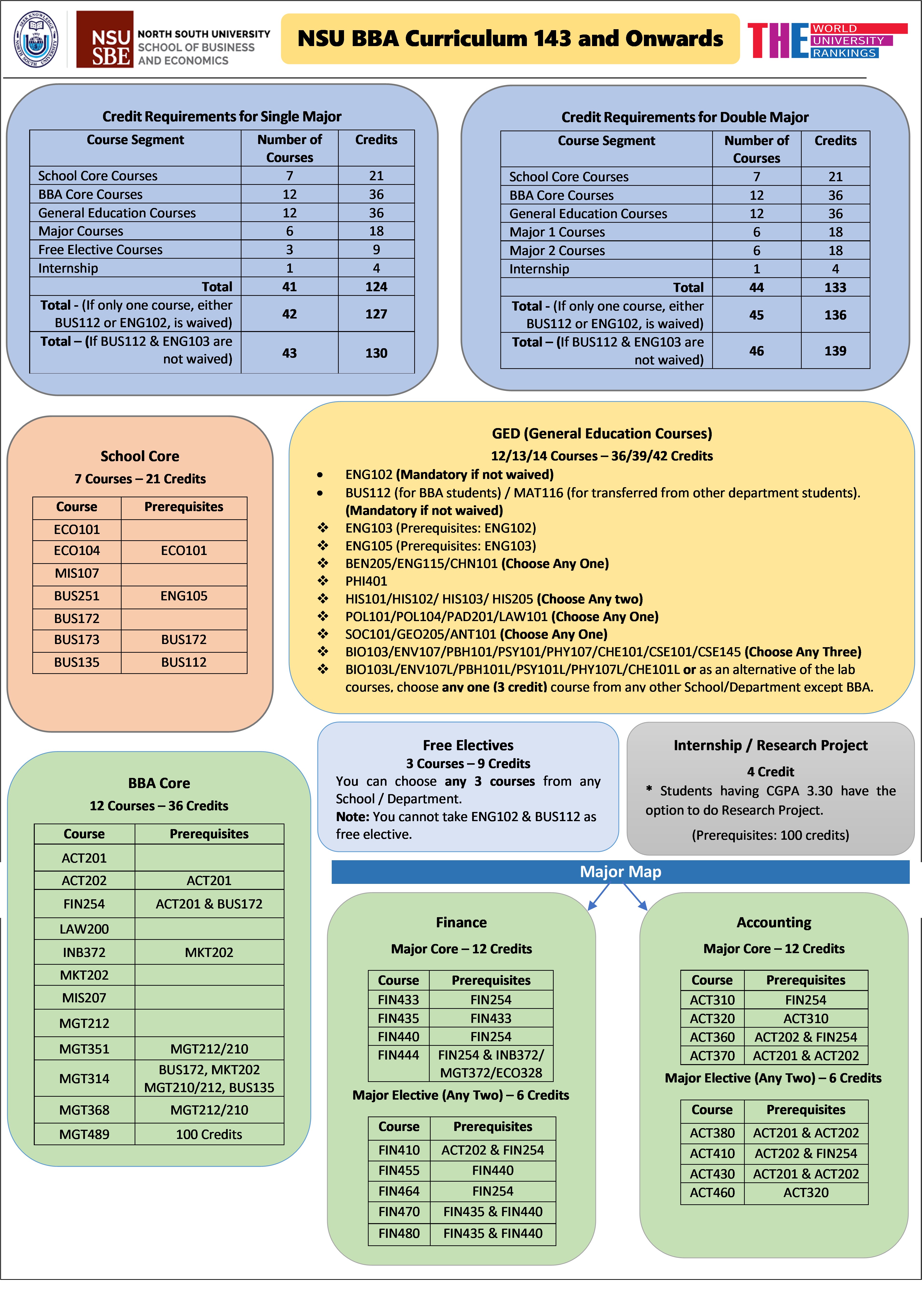 A student majoring in Finance must complete a total of six major courses (18 credit hours) offered by the Department of Accounting and Finance, four of which (12 credit hours) are required (compulsory) courses and two (6 credit hours) are elective courses from a list of alternative choices.