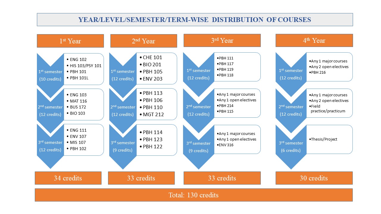 To earn a BPH degree, all students must satisfactorily complete 130 credits of coursework, including General Education (GED) courses (university and school GED courses), core courses; specific area or track required major courses, some open electives, a thesis, and a field practice/practicum.