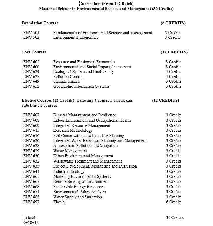 ENV 609: Integrated Resource Management: Concept & Dynamics of INRM; History, evolution, and characteristics of INRM; Challenges and Issues of INRM in practice; Elements of an Integrated Resource Management Approach; Social, political, cultural, institutional, economic, and ecological dimensions of IRM; Linkages between natural and social systems: resilience, sustainability and other perspectives; Indigenous Knowledge (IK) in IRM; Significance and processes of community involvement in IRM; Developing participatory and local level planning for IRM options; Understanding research & learning in the context of IRM Process, tools and strategies; Case studies on sectoral integration: Integrated Watershed Management; Government plan and guidelines; Review of Selected NRM Policies in Bangladesh. 3 credits