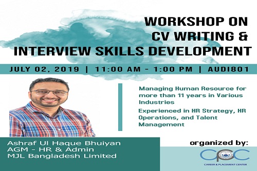 To prepare the students of NSU for their career ahead, CPC arranged “CV Writing Workshop-1”. This houseful workshop took place at AUDI801 on 2 July, 2019. The whole workshop along with a Q&A session was conducted by Ashraf Ul Haque Bhuiyan, AGM – HR & Admin of MJL Bangladesh Limited. He shared valuable insights regarding CV writing & Interview development skills with the students and encouraged them to choose a career as an HR Professional.