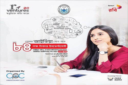 The flagship digital entrepreneurship platform, “r-ventures”, initiated by Robi Axiata Limited, was organized with coordination from CPC at NSU on 17 July, 2019. This was their second installment of the program. The program was conducted to get new business ideas that will help solve societal problems and the best ideas would get investment upto 84 lakhs BDT by Robi. Our guest speakers from Team-Robi were Shafeen M Eunus Daud, Tasnuva Ahmed, Moinuddin Mortuza and Rezwan Arefin .