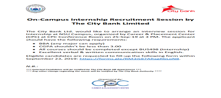 The City Bank Limited conducted an on campus recruitment session to get the best of the best candidates for their internship program. Arpon Kumar Saha (Manager, Recruitment Process) and Tanjila Haque (Assistant Manager, Recruitment & MIS) conducted the interview session. In total 35 students were shortlisted and got the opportunity for further selection process in this session.