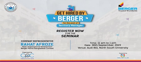 Berger paints Bangladesh Ltd. is one of the oldest and technologically advanced name in the paint industry. They have always paid a special focus to recruit the brightest candidates from around the country. In this regard they arranged a seminar, with the support of CPC to collect the CVs of the students of NSU with the purpose of getting the best candidates for their Territory Manager position. The seminar was supervised by the head of organizational development department.