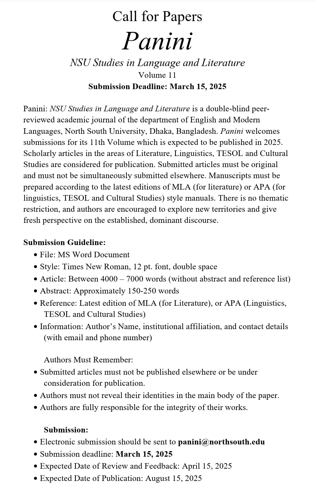 Panini: NSU Studies in Language and Literature is a double-blind peer-reviewed academic journal of the Department of English and Modern Languages, North South University, Dhaka, Bangladesh. Panini welcomes scholarly articles in the areas of Literature, Linguistics, TESOL, and Cultural Studies for consideration for publication.