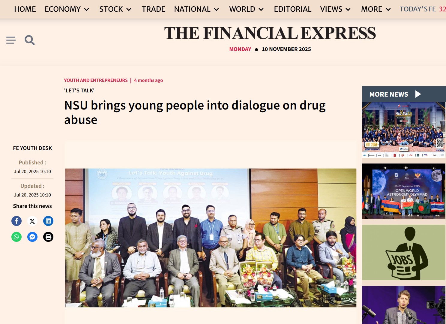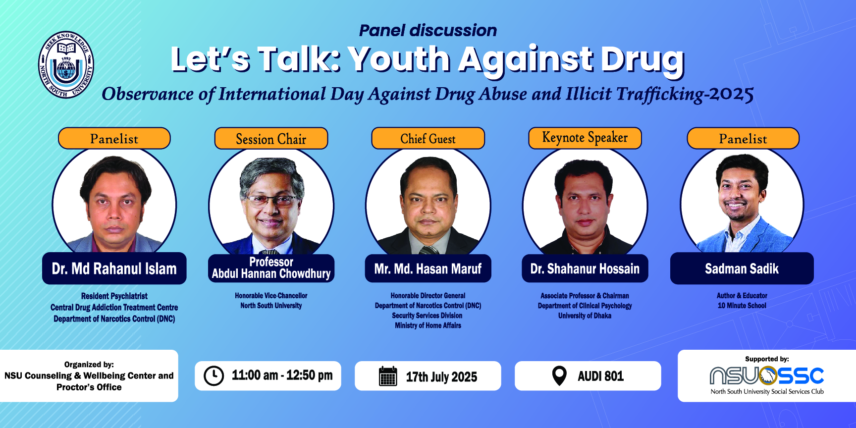 Counseling and Wellbeing Center and Proctor's Office of NSU jointly organized a panel discussion, "Let's Talk : Youth Against Drug" to observe International Day Aaginst Drug Abuse and Illicit Trafficking-2025. This program supported by NSU Social Services Club.