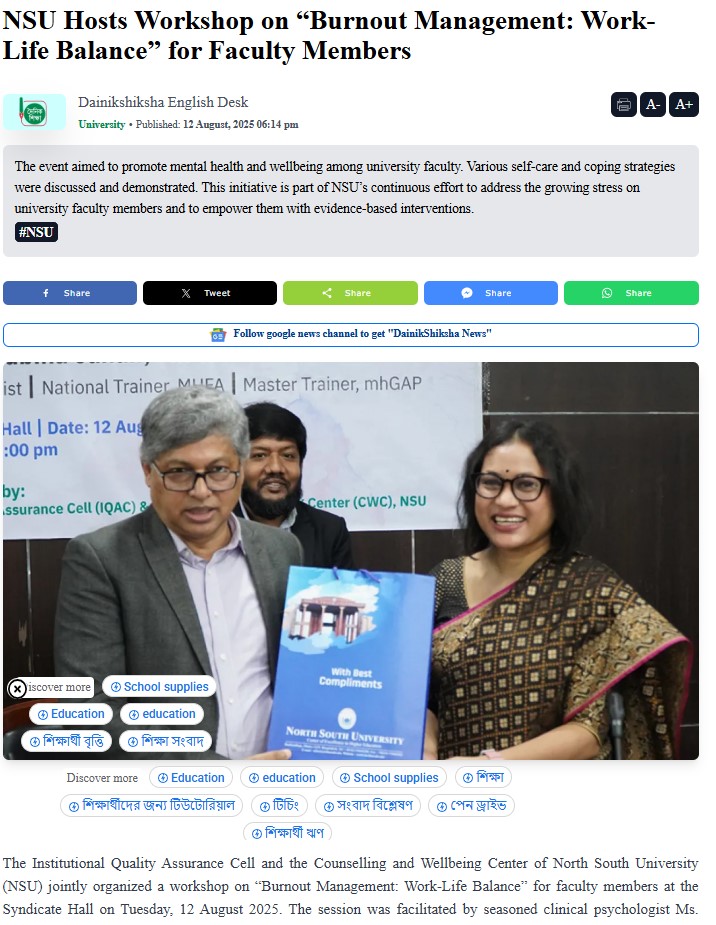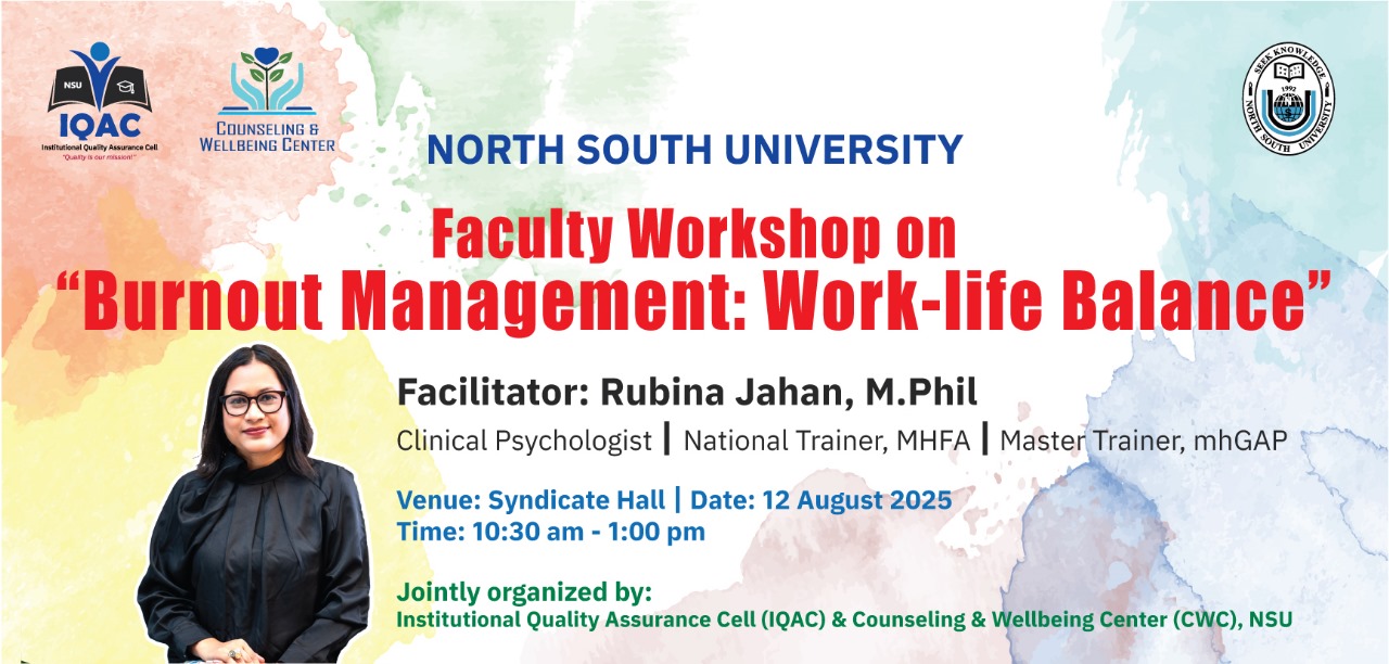 Counseling and Wellbeing Center (CWC) and Instititutional Quality Assurance Cell (IQAC) of NSU jointly organized "Burnout Management" Workshop for the Faculty Members of NSU.