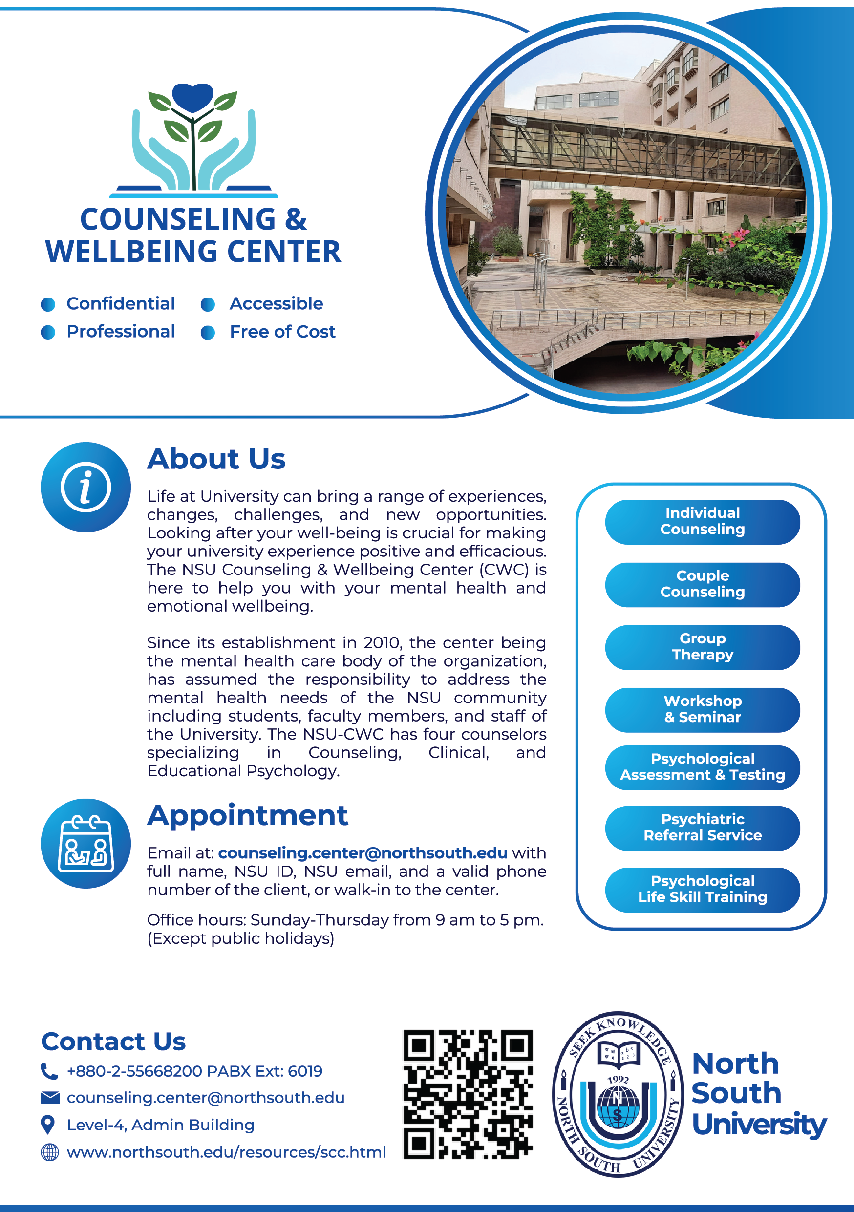 The NSU-CWC offers one-to-one or group sessions. It has 4 professional psychologists working as counselors, specializing in Counseling, Clinical, and Educational Psychology.