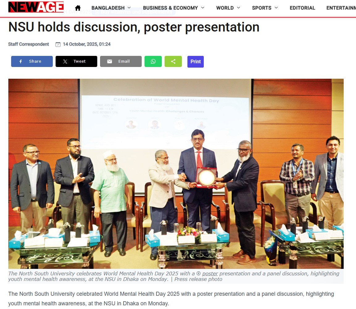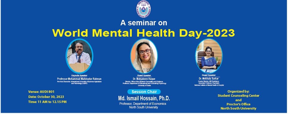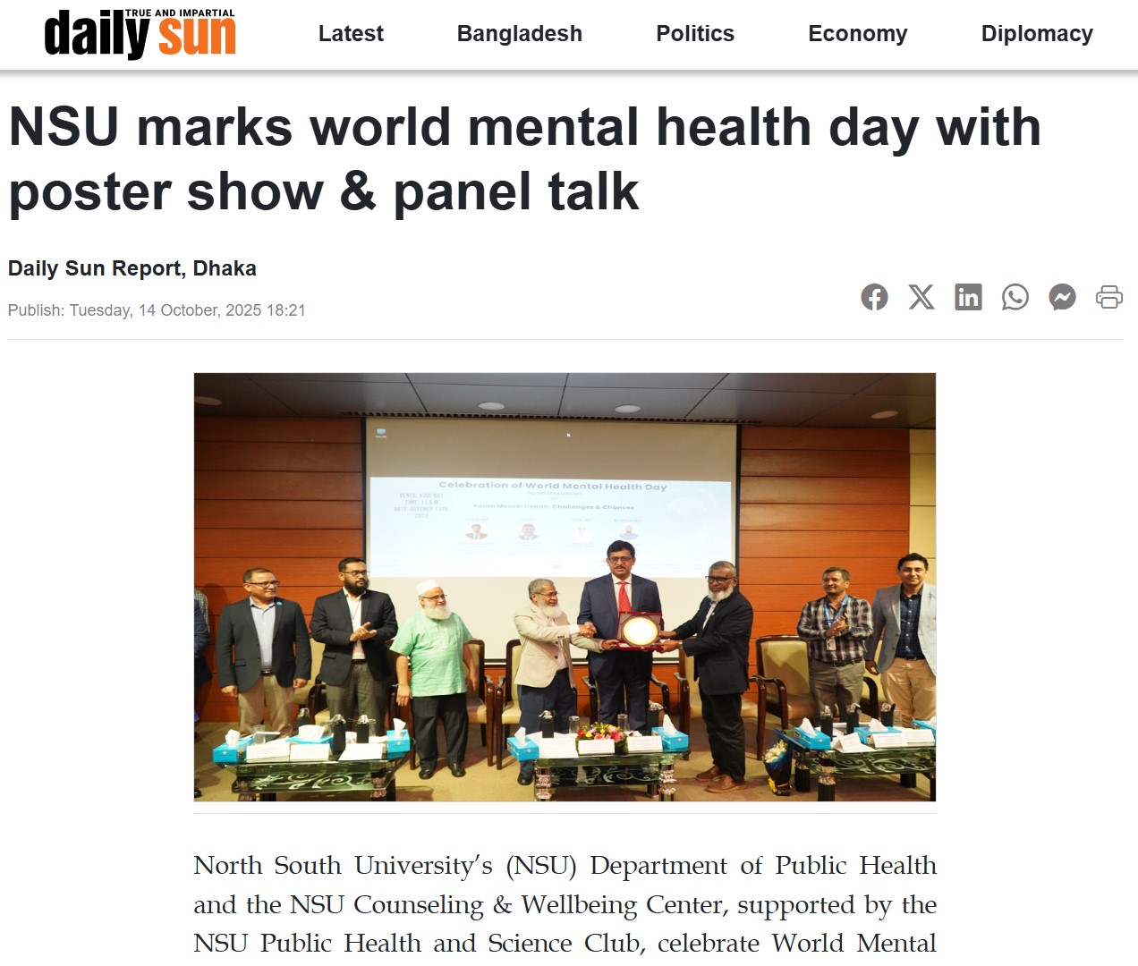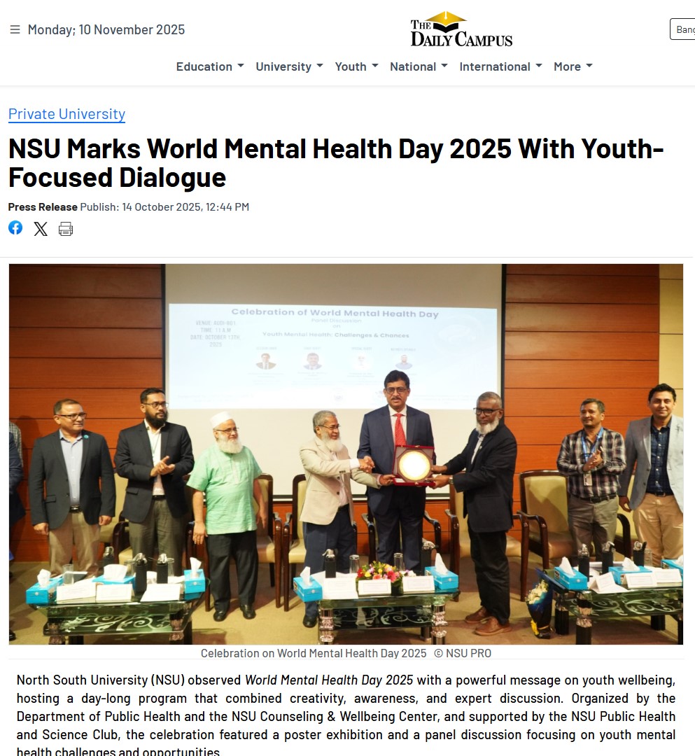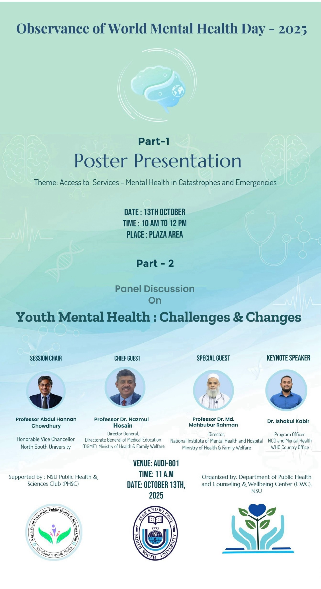 Counseling and Wellbeing Center (CWC) and Department of Public Health and Supported by NSU Public Health and Science Club of NSU, jointly organized a Poster Presentation and Panel Discussion to observe World Mental Health Day-2025.